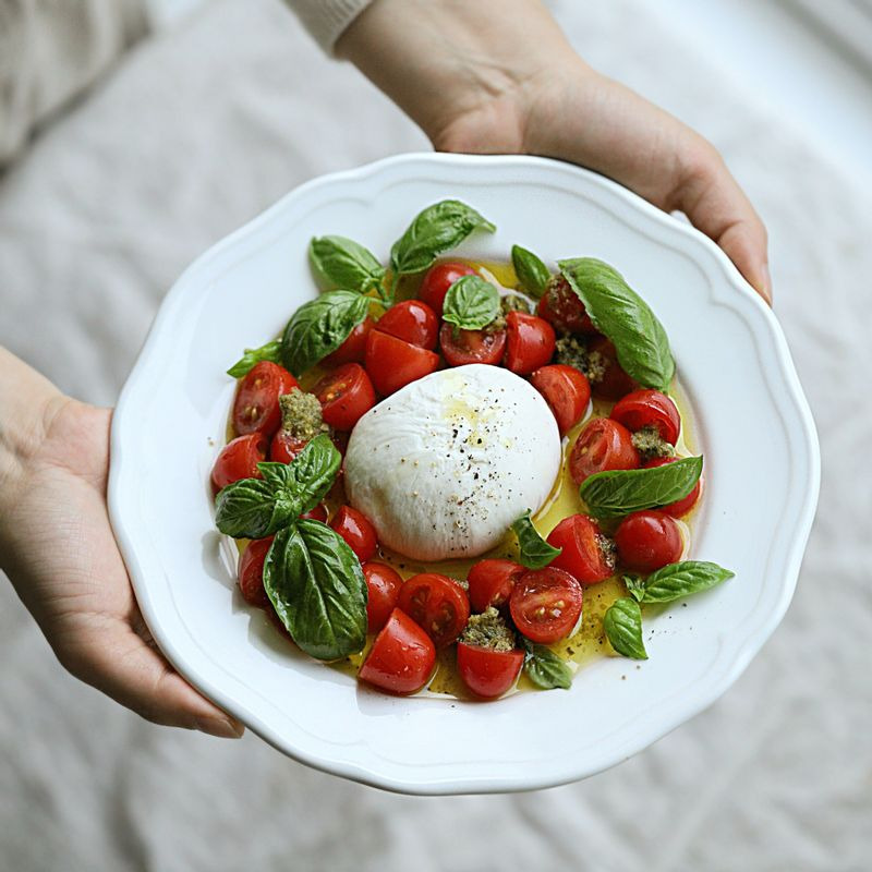 - 신선한 토마토와 함께 부라타 치즈를 곁들이면 정말 환상적인 맛이 나요. 여기에 올리브 오일과 바질을 살짝 올리면 카프레제 샐러드가 완성됩니다. 토마토의 산미와 치즈의 부드러움이 잘 어울리죠.